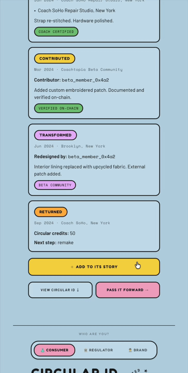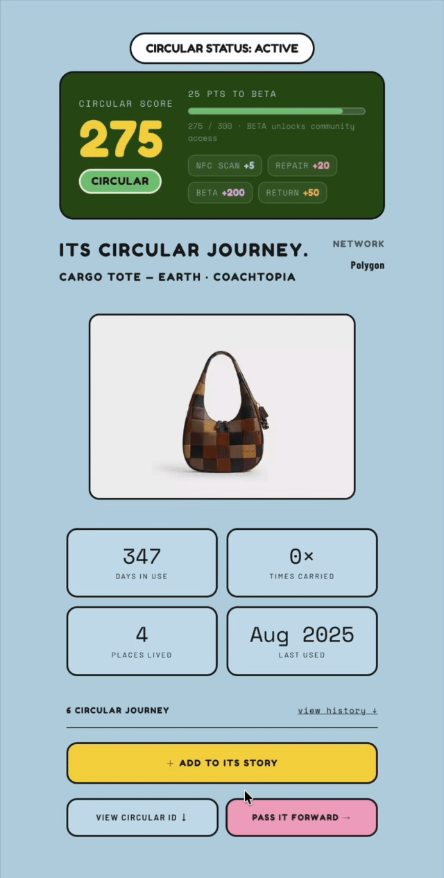 Vestige is a Digital Product Passport infrastructure that gives every item a verifiable, traceable identity while routing smart-contract royalties back to the brand on every resale.