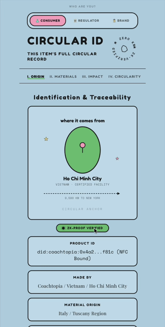 ZK-verified provenance, NFC authentication, and smart-contract royalties that turn ESPR compliance into a recurring revenue layer. Save 4% tax from compliance.